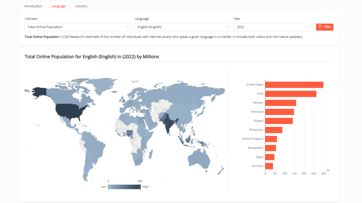Use CSA Research’s online GEP (eGDP) to evaluate the revenue potential offered by different languages. By understanding the online population and economic opportunity in your target markets.