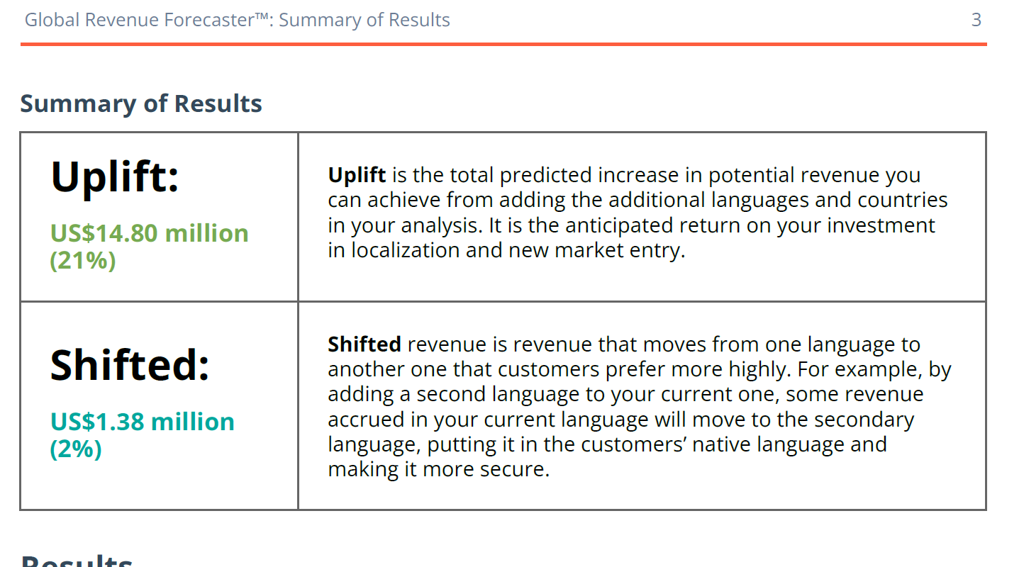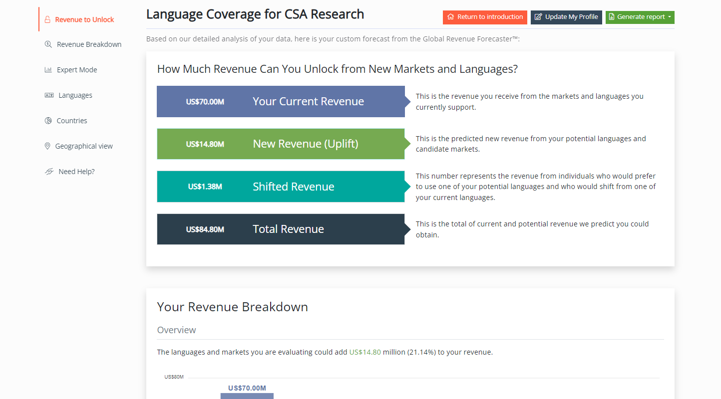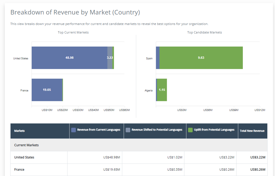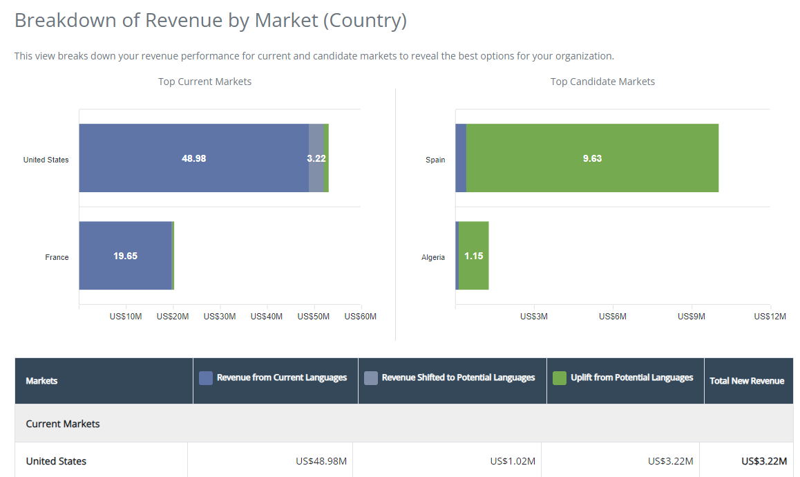 The Global Revenue Forecaster™ delivers predictive business analytics tailored to your company’s business and verticals to estimate potential revenue from additional languages.